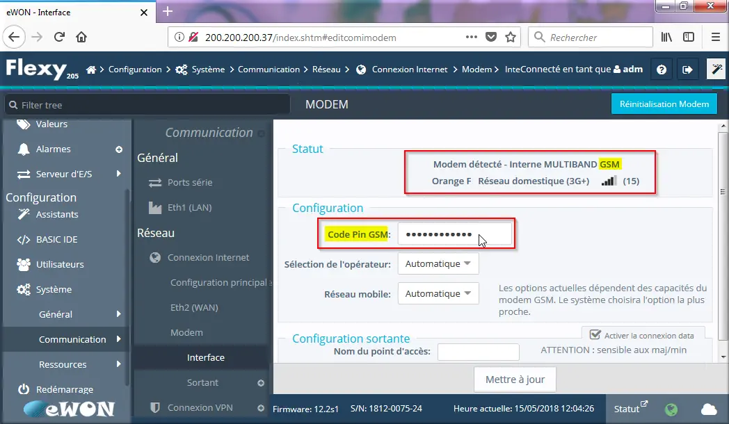 Ne pas oublier de paramétrer le code pin de la carte SIM du modem. Laisser la sélection de l’opérateur et du réseau en automatique.