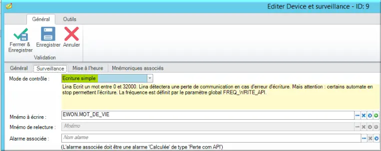 Déclaration du tag COM_ENVOI_MotDeVie (registre Modbus 200) correspondant au mot de vie lu dans l’automate ou Lina selon les cas.