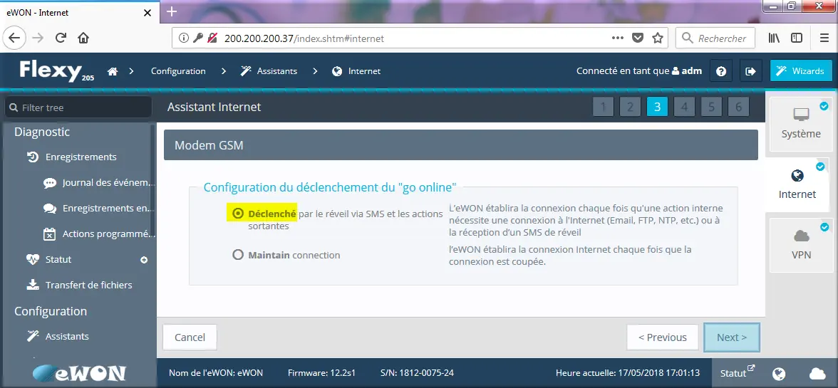- Pour cet essai, on choisit la connexion modem : carte GSM.